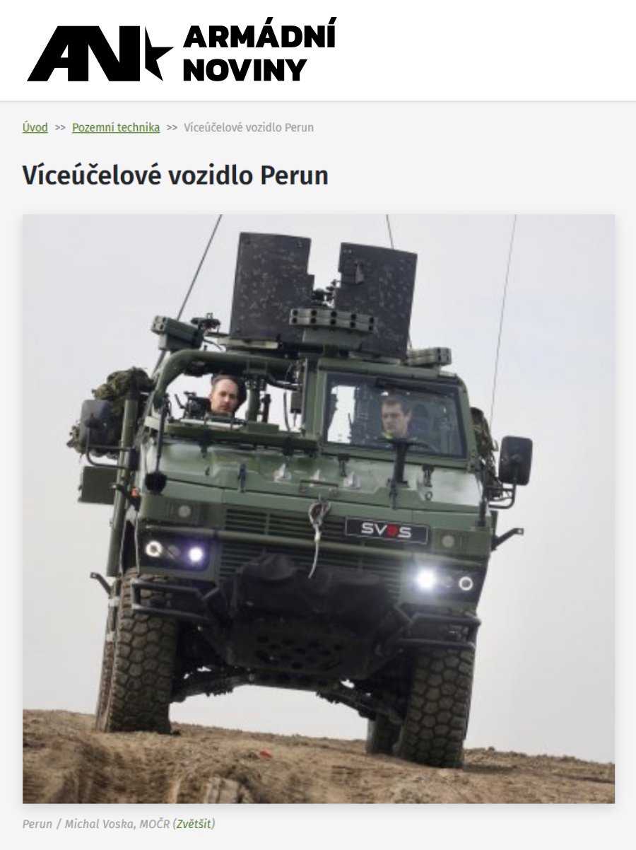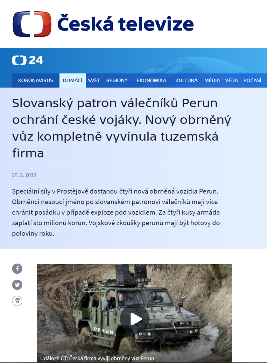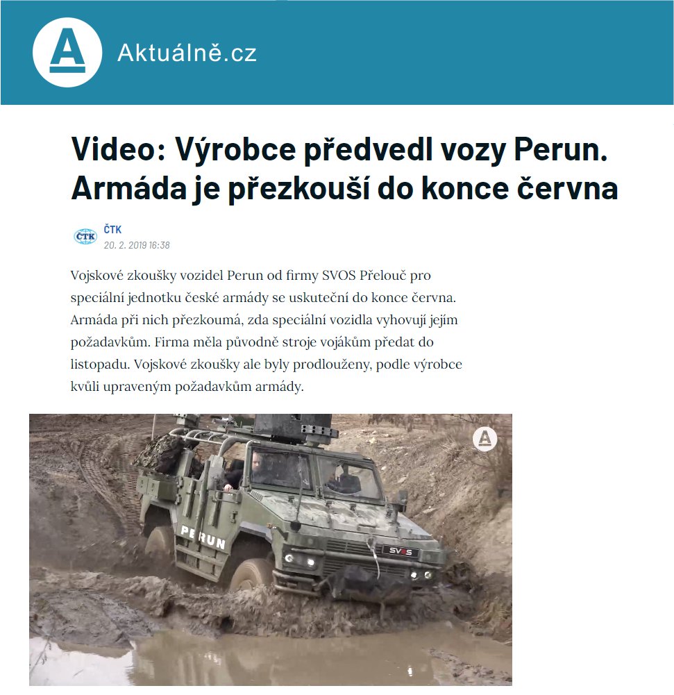 Společnost SVOS, spol. s r.o., zahájila v roce 2014 vývoj speciálního obrněného víceúčelového vozidla Perun pro vojenské a v sekundární roli též policejní sbory, které zajišťuje vysokou úroveň ochrany posádky proti střelbě z palných zbraní a proti následkům výbuchu min a nástražných ...